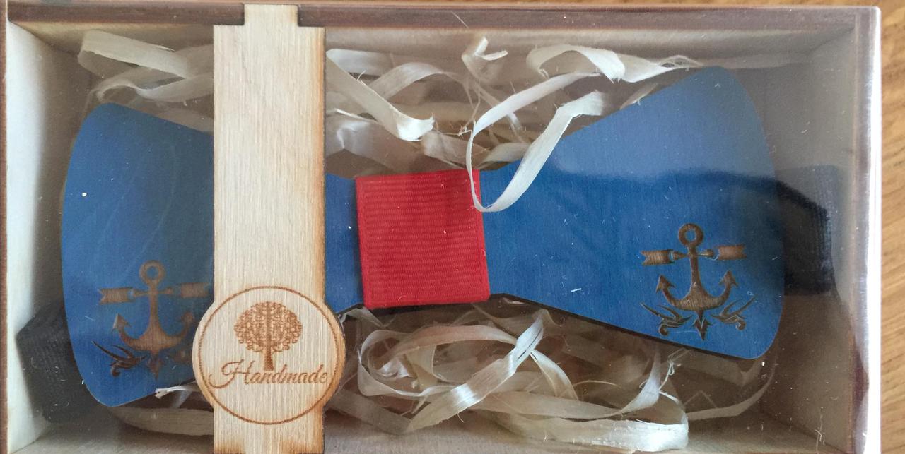 Käsitööna valminud puidust kikilips. Kikilips on karbis.