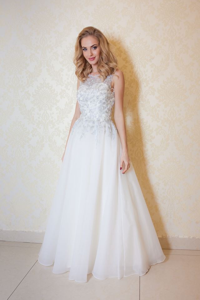 Valge tüllist kleit, korsett tagant reguleeritud paeletga. Korsetil hõbedane tikand.
