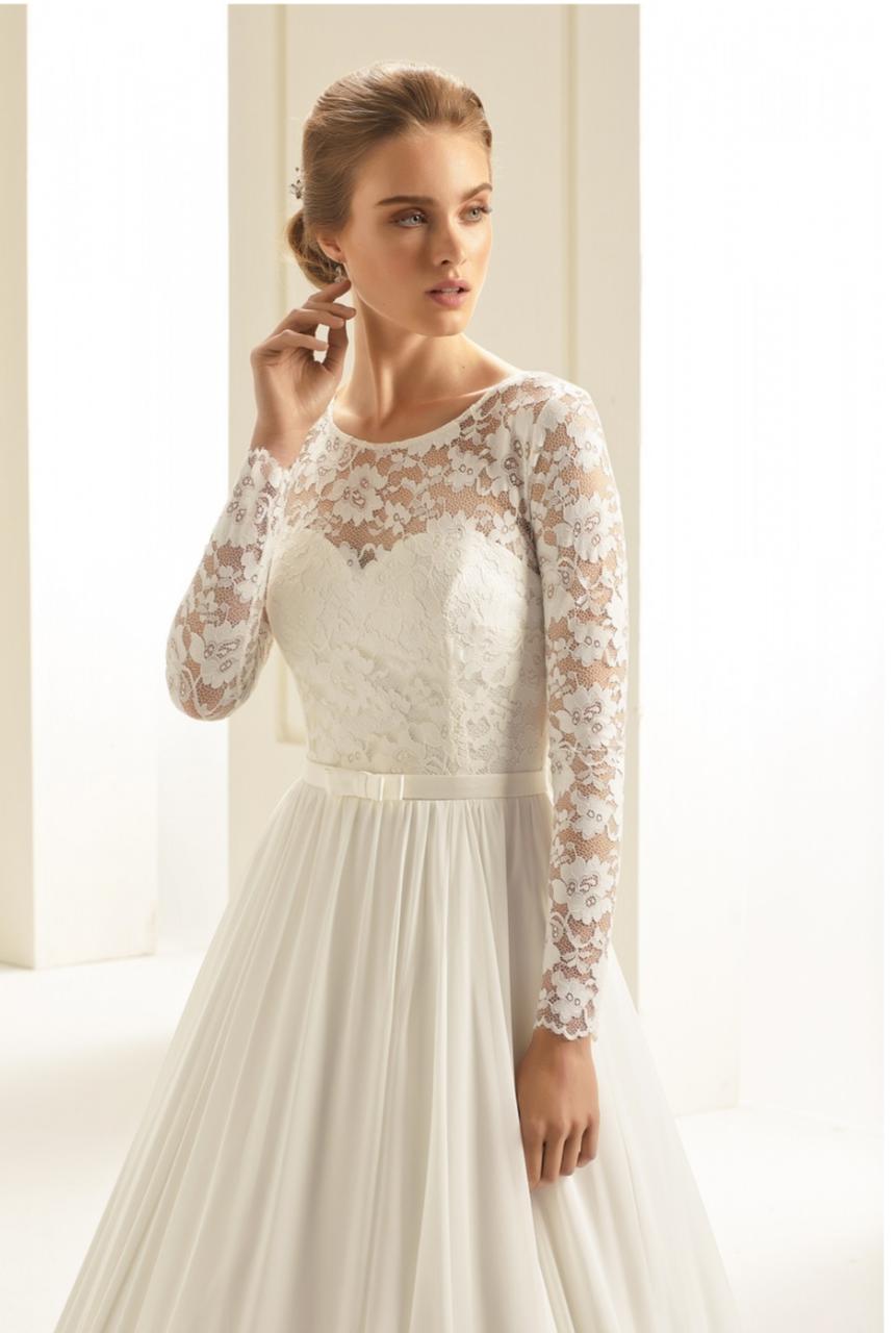 A- lõikega pruutkleit. Kvaliteetne sifoonkleit, korsett ja varrukad venivast pitsist. Kleit on sabaga ja vööga.