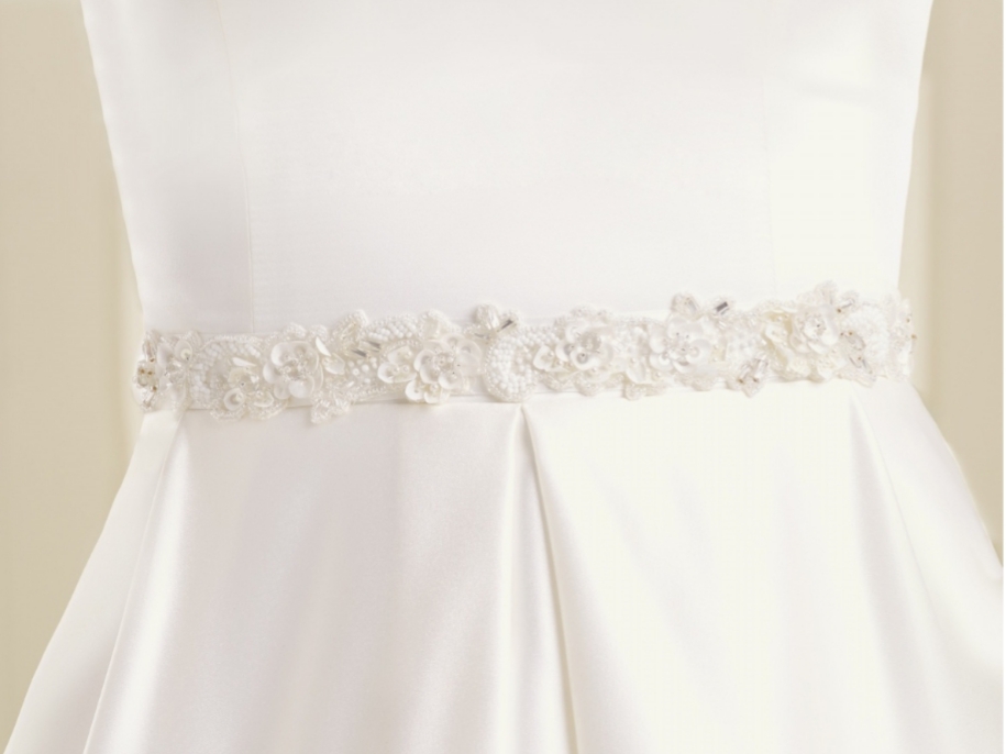 Elegantne satiinist vöö, kaunistatud pitsi ja dekoratiivkividega.