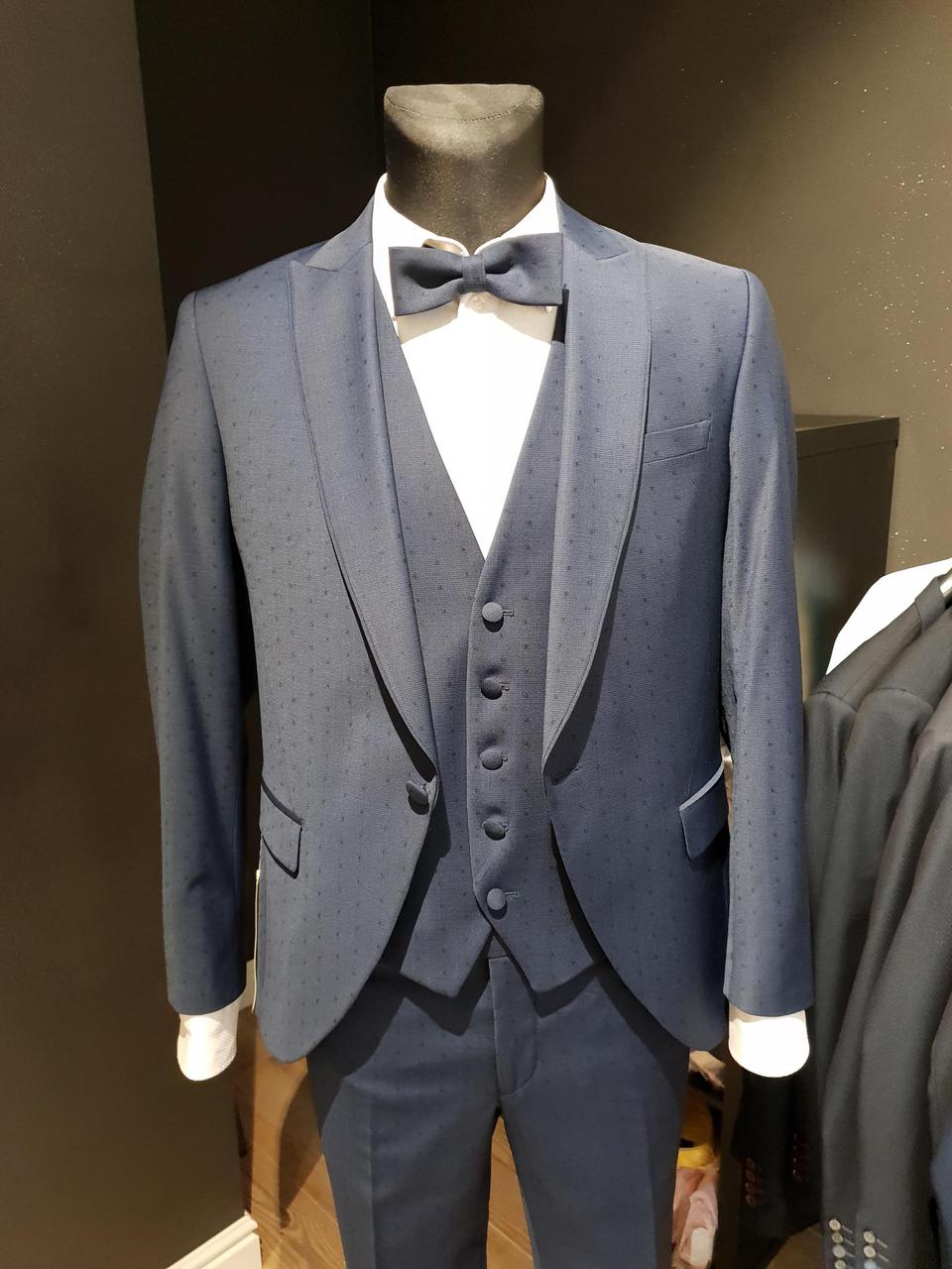 Tumesinine ülikond, mille komplekti kuulub pintsak, püksid, vest, kikilips.